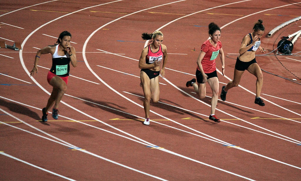 Ground contact during accelerative sprinting. Unlike the other two events above starting for the 400 is staggered. There is a high probability that the pole vaulters and high jumpers are rather territorial of out mats.